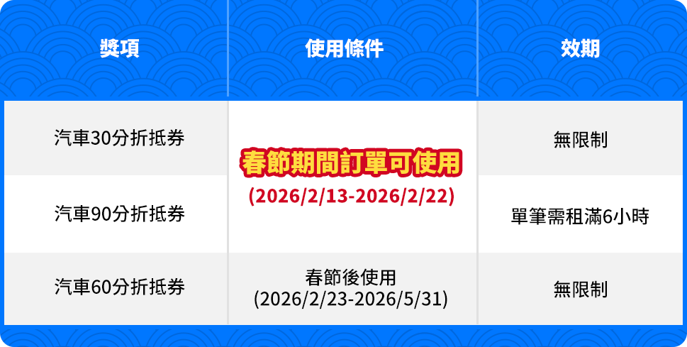 春節期間完成訂單取車,即抽刮刮樂乙次